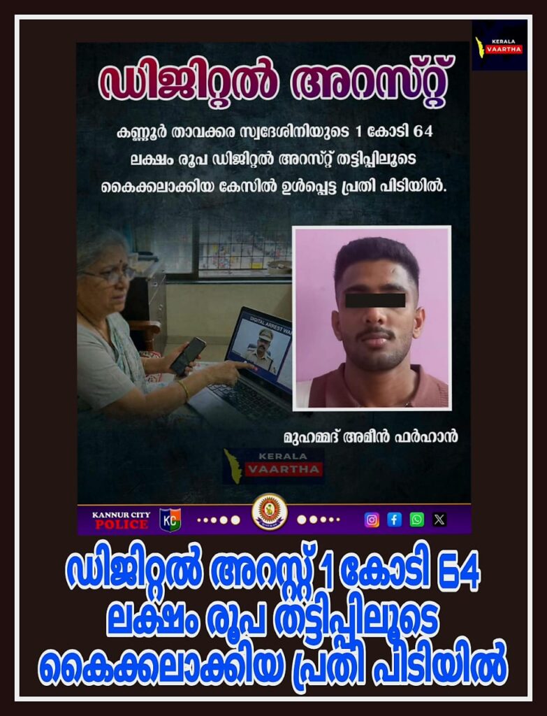 കണ്ണൂർ : താവക്കര സ്വദേശിനിയുടെ ഒരുകോടി 64 ലക്ഷം രൂപ ഡിജിറ്റൽ അറസ്റ്റ് തട്ടിപ്പിലൂടെ കൈക്കലാക്കിയ കേസിൽ ഉൾപ്പെട്ട പ്രതി പിടിയിൽ.