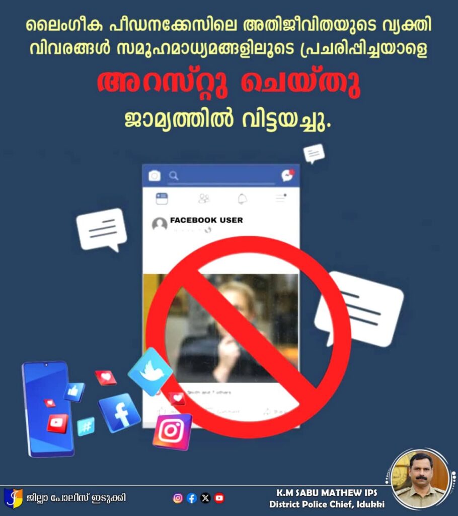 ശ്രീ. രാഹുൽ മാങ്കൂട്ടം MLA ക്ക് എതിരായുള്ള ലൈംഗീക പീഡനക്കേസിലെ അതിജീവിതയുടെ ചിത്രങ്ങളും, വ്യക്തി വിവരങ്ങളും സോഷ്യൽ മീഡിയയിലൂടെ പ്രചരിപ്പിച്ച നെടുങ്കണ്ടം പോലീസ് സ്റ്റേഷന് പരിധിയിലുള്ള പ്രതിയെ അറസ്റ്റ് ചെയ്തു ജാമ്യത്തില് വിട്ടയച്ചു. സമാനരീയിലുള്ള മറ്റൊരുകേസും തൊടുപുഴ പോലീസ് സ്റ്റേഷനില് രജിസ്റ്റര് ചെയ്ത് അന്വേഷണം ആരംഭിച്ചിട്ടുണ്ട്. ഇത്തരം കേസുകളില് ഉള്പ്പെടുന്ന അതിജീവിതയുടെ വിവരങ്ങള് അപകീര്ത്തി ഉണ്ടാകുംവിധം യാതൊരുതരത്തിലും പരസ്യപ്പെടുത്തുവാന് പാടില്ലാത്തതും, സ്വകാര്യത സംരക്ഷിക്കുന്ന നിയമങ്ങളുടെ ലംഘനവുമായതിനാലാണ് കേസ്സ് എടുത്തിരിക്കുന്നത്. ഇത്തരത്തിലുള്ള നിയമവിരുദ്ധമായ പ്രവർത്തികൾക്കെതിരെ തുടര്ന്നും കർശനമായ നിയമനടപടികൾ സ്വീകരിക്കുന്നതാണ്.